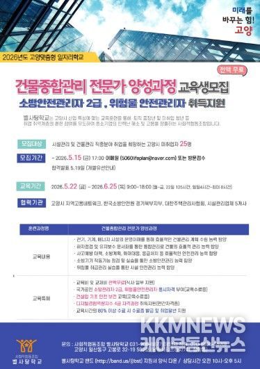 KKMNEWS 김교민 기자 | 고양특례시는 중장년과 청년 미취업자의 재취업을 지원하는 2026년 고양맞춤형 일자리학교의 일환으로, ‘건물종합관리 전문가 양성과정’에 참여할 교육생을 모집한다고 29일 밝혔다.