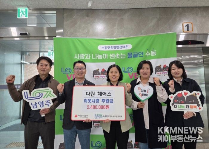 KKMNEWS 김교민 기자 | 남양주시는 지난 28일 수동면 소재 다원체어스가 수동면 어르신들을 위한 후원금 240만 원을 수동면 지역사회보장협의체에 전달했다고 29일 밝혔다.