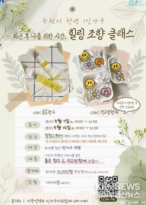 영통구에서는 청년 1인가구 비율이 높은 지역 특성을 반영해 정서 지원 중심 프로그램 ‘힐링 조향 클래스’를 운영한다. 5월 7일과 14일 청청스퀘어에서 열리며, 회차별 15명씩 총 30명이 참여할 수 있다.