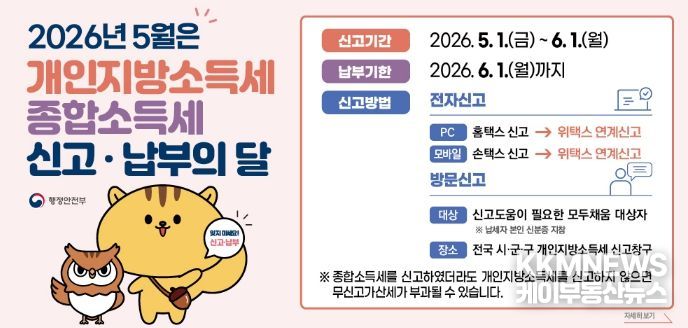 KKMNEWS 김교민 기자 | 파주시는 납세자 편의를 위해 오는 5월 6일부터 6월 1일까지 파주시청 신관 1층 지방세민원실에 ‘종합소득세·개인지방소득세 신고 도움 창구’를 운영한다.