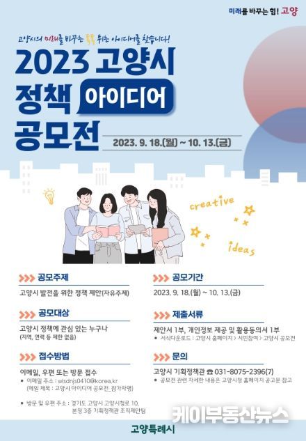 케이부동산뉴스 김교민 기자 | 고양특례시는 고양시의 미래를 바꿀 작지만 발전적인 아이디어를 발굴하기 위해 9월 18일부터 10월 13일까지 ‘2023년 고양시 정책 아이디어 공모전’을 진행한다.