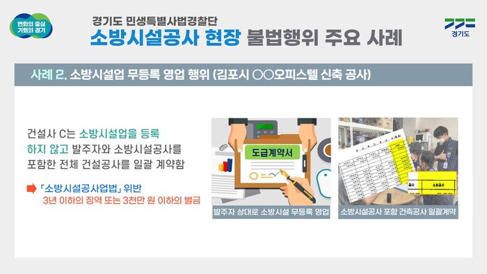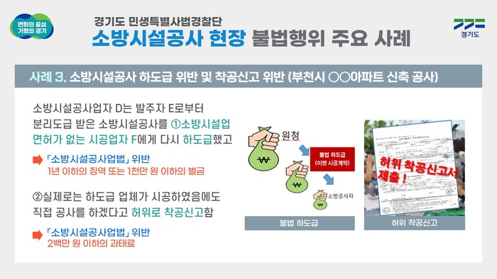 주요 사례를 보면 화성시 소재 복합건축물 신축공사현장 발주자 ‘A’는 소방시설공사업자가 아닌 종합건설사 ‘B’에게 소방공사를 포함한 건축공사 전체를 150억 원에 도급계약해 소방시설공사 도급위반과 분리도급 위반으로 적발됐다.