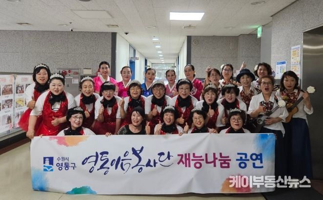 케이부동산뉴스 김교민 기자 | 지난 15일, 영통구 주민자치센터 동아리(프로그램) 공연팀으로 구성된‘영통이음봉사단’이 영통동 소재의 한 노인주간보호센터를 방문하여 재능기부 공연을 펼쳐 보였다.