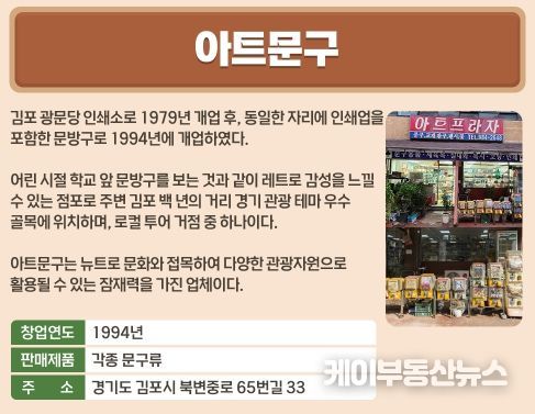 케이부동산뉴스 김교민 기자 | 김포시 북변동 소재 ‘아트문구’와 사우동 소재 ‘쉐프부랑제’가 경기도 우리 동네 오래된 가게로 선정됐다.
