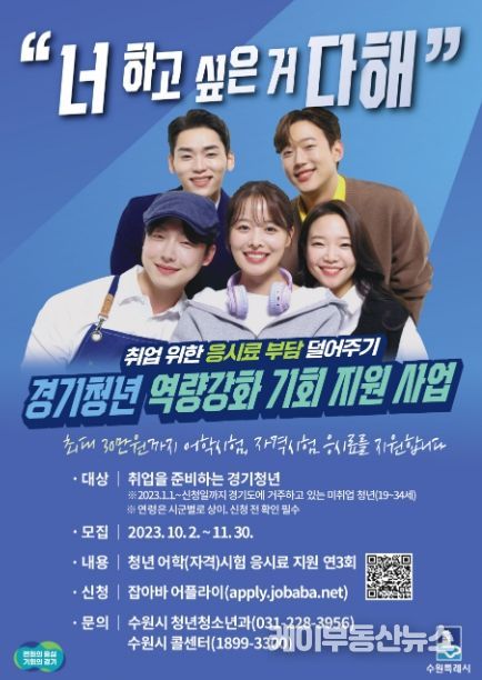 케이부동산뉴스 김교민 기자 | 수원시가 취업 준비 청년을 대상으로 어학‧자격시험 응시료를 지원하는 ‘경기청년 역량강화 기회 지원 사업’ 신청을 10월 2일부터 11월 30일까지 받는다.