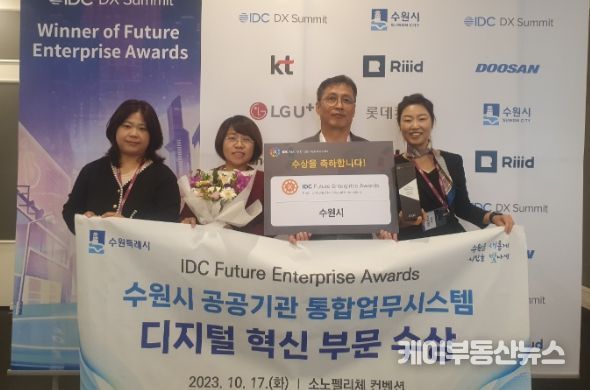 케이부동산뉴스 김교민 기자 | 수원시가 17일 소노펠리체 컨벤션에서 열린 ‘2023 IDC 퓨처 엔터프라이즈 어워드’에서 디지털혁신특별상을 받았다.