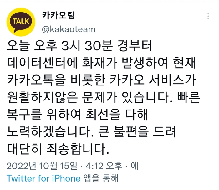 카카오는 "오늘 오후 3시 30분 경부터 데이터센터에 화재가 발생하여 현재 카카오톡을 비롯한 카카오 서비스가 원활하지않은 문제가 있습니다. 빠른 복구를 위하여 최선을 다해 노력하겠습니다. 큰 불편을 드려 대단히 죄송합니다."라고 트위터를 통해 안내하고 있다.