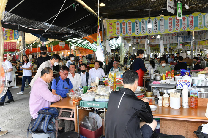 모란민속5일장 상인회는 밥, 뭇국, 홍어회, 전, 떡, 음료, 과일이 한 상으로 차려진 2000명분의 중식을 어르신들에게 오후 12시부터 선착순 무료 제공한다.