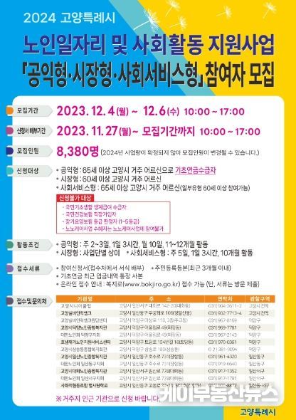 케이부동산뉴스 김교민 기자 | 고양특례시가 총 332억원을 투입해 노인일자리 수행기관 12개소에서 2024년 노인일자리 및 사회활동지원 사업을 운영한다. 고양시는 12월부터 노인일자리 참여자 8,380명을 모집할 예정이다.