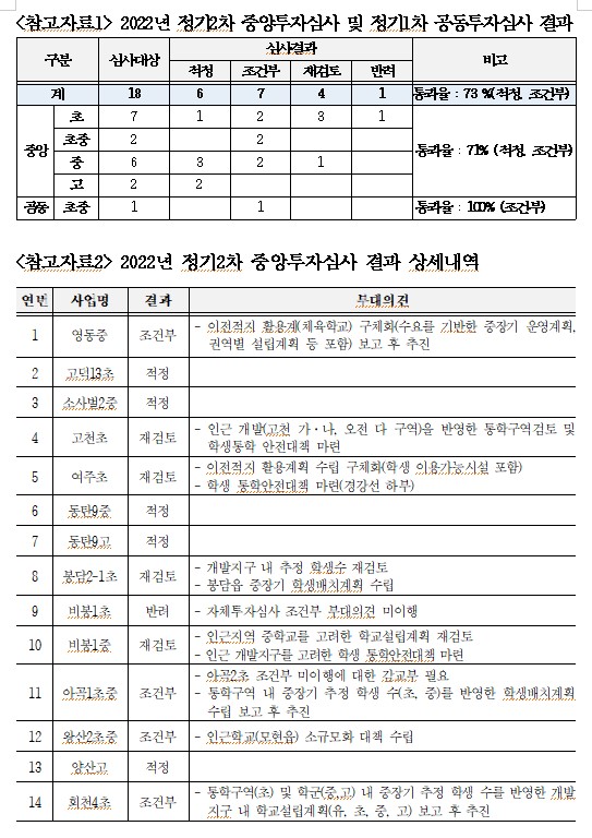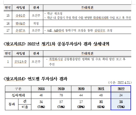 이어, 21일 열린 교육부-행안부 공동 투자심사에서는 1교 가운데 1교가 ‘조건부’로 심사를 통과했다고 설명했다.
