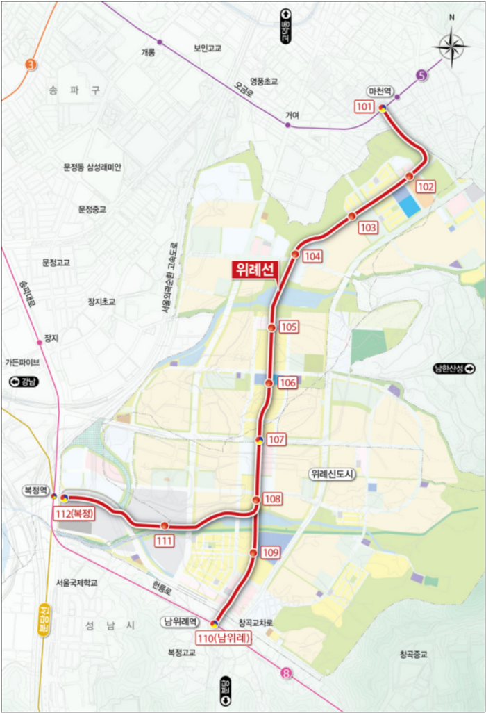위례선(트램)은 서울 남동부 송파구 남쪽에 있는 대규모 신도시인 위례신도시의 교통난 해소 및 대중교통 편의성을 높이기 위해 마천역(5호선)에서 복정역(8호선‧수인분당선)과 남위례역(8호선)까지 총 연장 5.4㎞을 트램으로 연결하는 친환경 신교통 사업이다. ’25.9월 개통 예정이다.