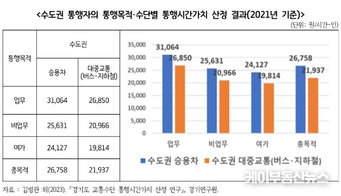 보고서에 따르면 교통정책 결정의 중요한 지표로 활용되고 있는 통행시간가치는 통행자가 1시간의 통행시간을 절감하기 위해서 지불하고자 하는 금전적 가치를 의미하고 있다. 국가 지침에서 제시된 통행시간가치는 전국 지역 간 통행을 기반으로 산정된 결과로 실제 수도권의 통행행태와 통행시간가치를 반영하기에는 한계가 있다는 지적이다. 이는 수도권의 다양한 교통 사회간접자본(SOC) 사업 계획이 타당성 확보에 어려움을 겪고 수도권의 통행 특성과 대중교통 통행의 중요성이 고려되지 못하고 있는 실정으로 나타나고 있다.