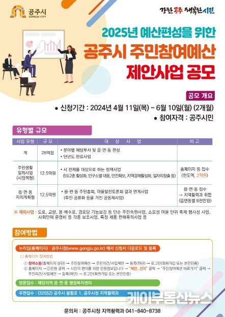 케이부동산뉴스 김교민 기자 | 공주시는 2025년 주민참여예산 편성을 위한 ‘주민참여예산 제안사업 공모’를 6월 10일까지 접수한다.