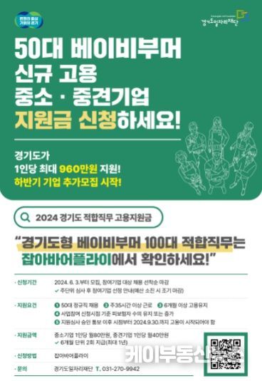 이 사업은 50대 도민을 경기도형 베이비부머 100대 적합직무에 해당하는 정규직으로 채용하는 도내 중소·중견기업에 1인당 최대 960만 원을 1년간 지원한다.