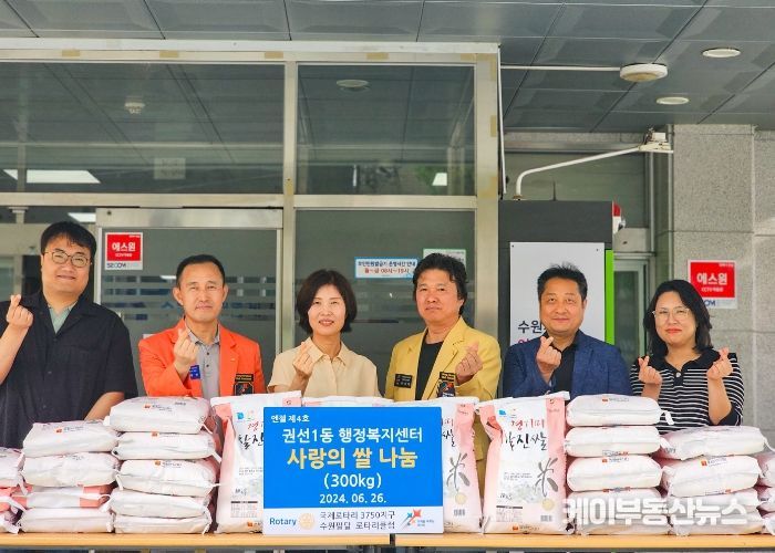 케이부동산뉴스 김교민 기자 | 지난 24일 국제로타리 3750지구 수원팔달로타리클럽에서는 권선1동에 백미 300kg를 전달했다.