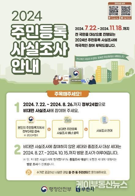 케이부동산뉴스 김교민 기자 | 부천시(시장 조용익)는 전 시민을 대상으로 7월 22일부터 오는 10월 15일까지 ‘2024년 주민등록 사실조사’를 실시한다.
