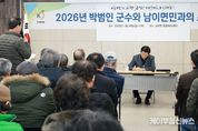케이부동산뉴스 김교민 기자 | 박범인 금산군수는 지난 29일 남일면행정복지센터에서 남일면민과의 대화를 통해 주민 생활과 직결된 현안과 건의사항을 청취하며 현장 중심의 군정 운영 방향을 공유했다. 이날 박범인 군수를 비롯해 군의회, 지역 기관단체장, 주민 등 총 100여 명이 참석했으며 지역 발전을 위해 노력한 유공자 3명에게 표창패를 수여 후 2026년 군정 추진방향 설명과 함께 주민 의견을 직접 듣는 시간을 가졌다. 박범인 군수는 “분야별로 제기된 의견을 종합해 추진 가능 과제는 신속히 반영하고 중장기 검토가 필요한 사안은 부서 검토 및 단계별 실행계획을 마련하겠다”고 말했다.